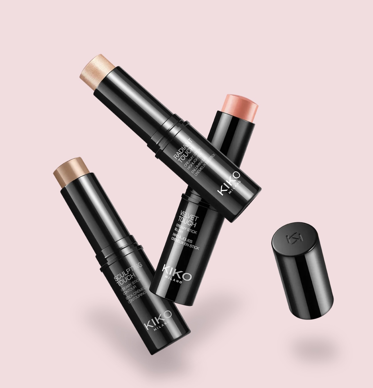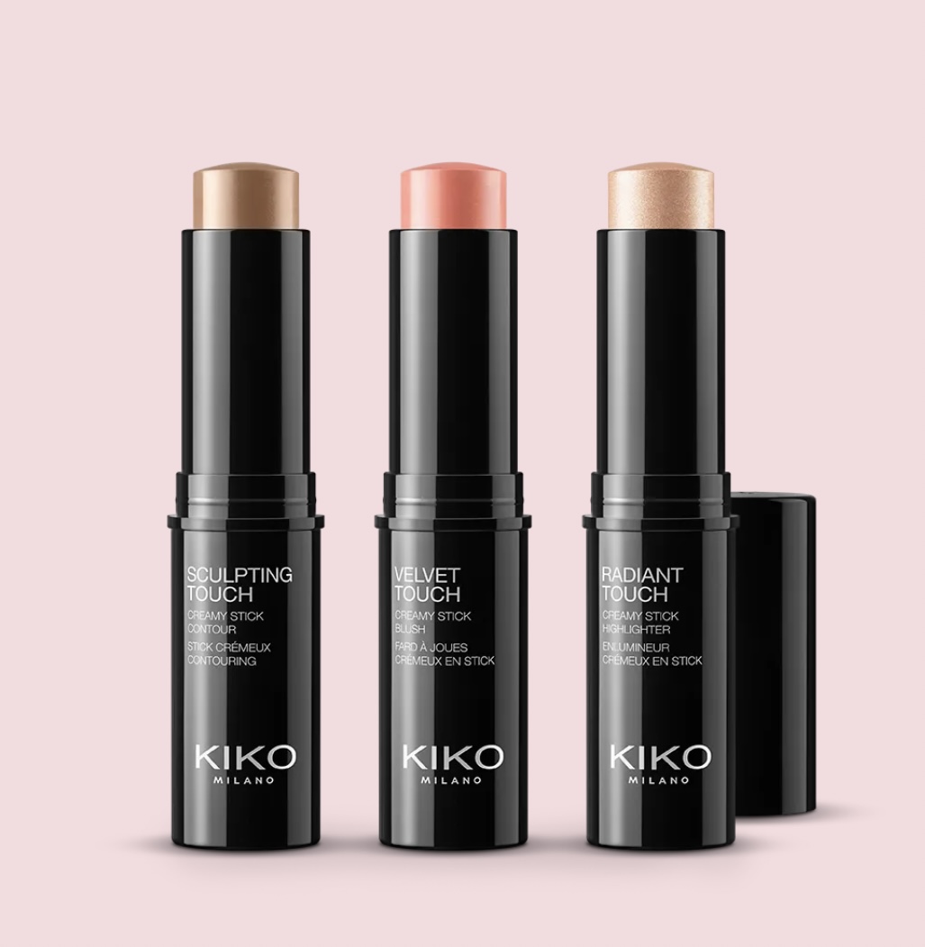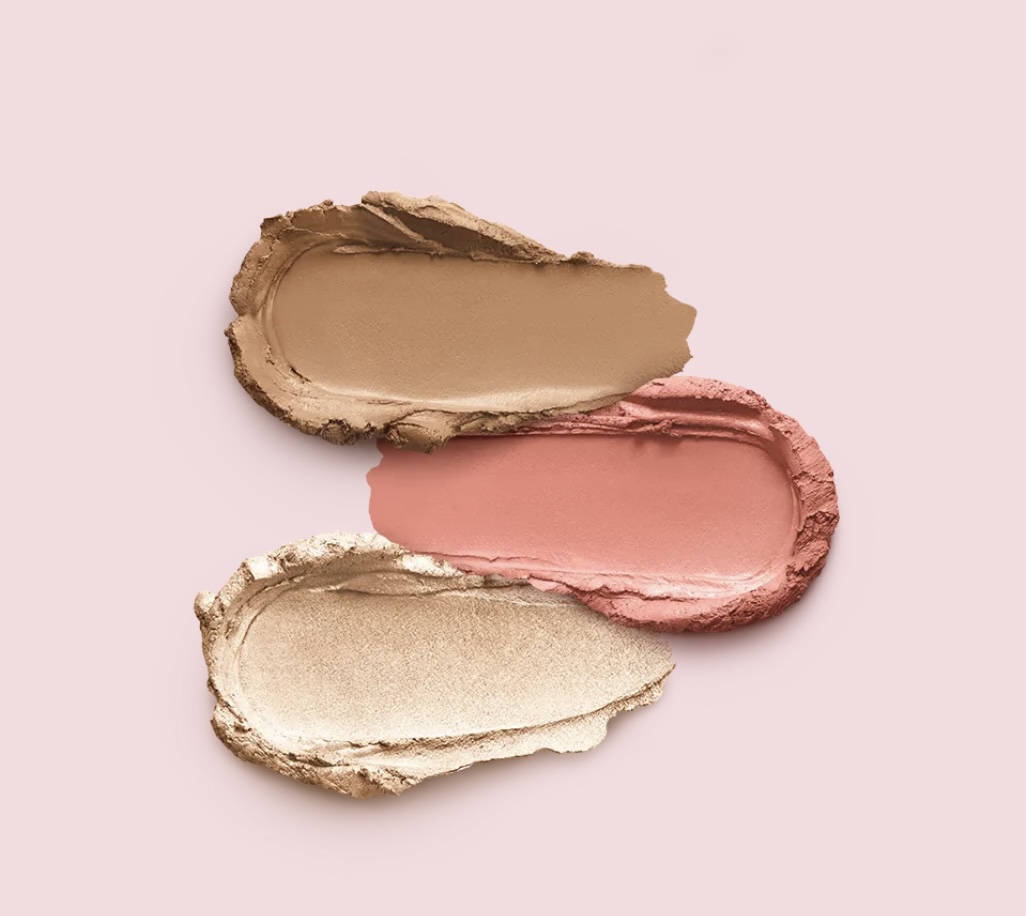 Kit de maquillage visage composé d’un blush, d’un enlumineur et d’un contour du visage, tous en sticks, dans une élégante boîte en papier.