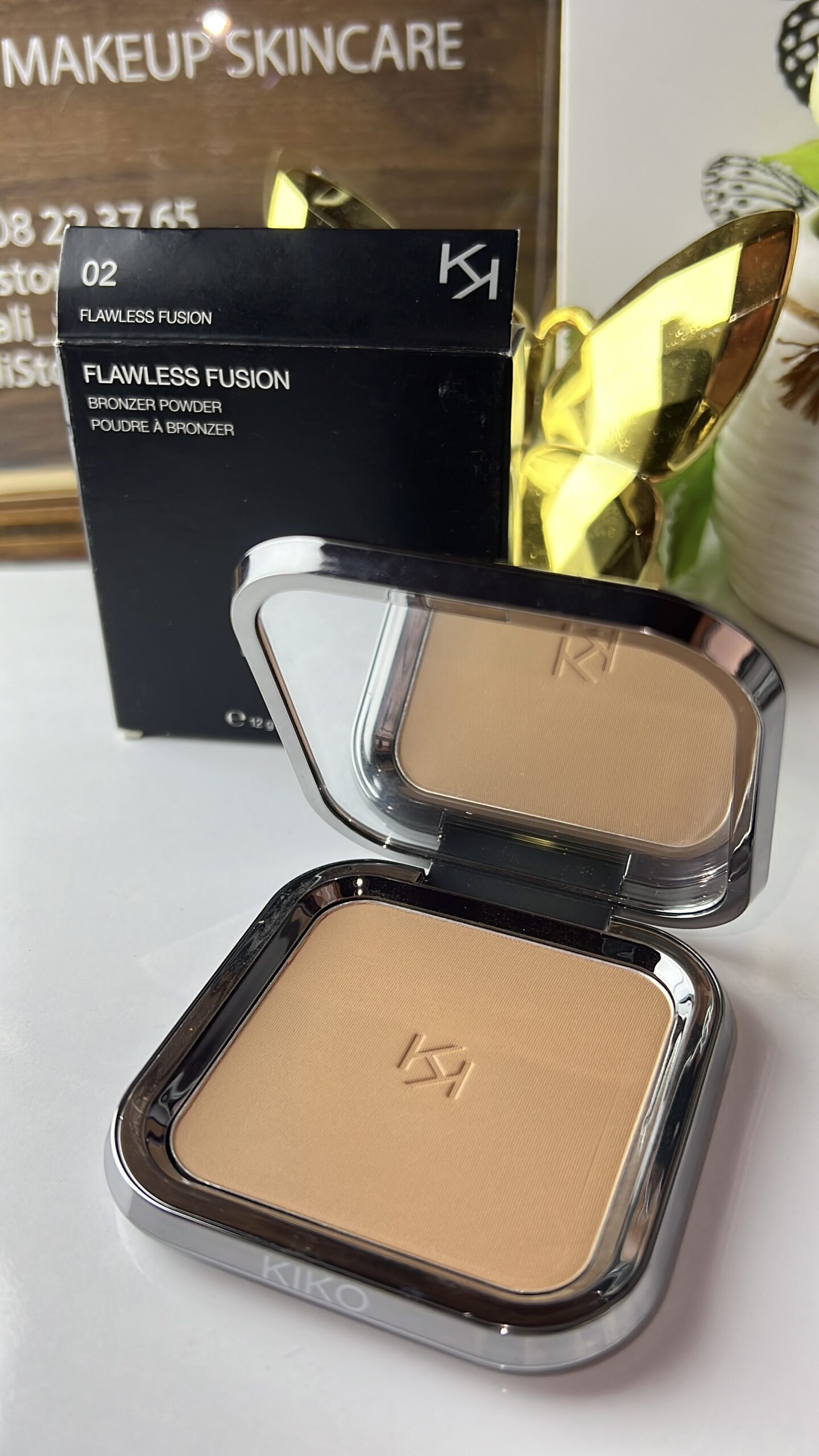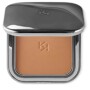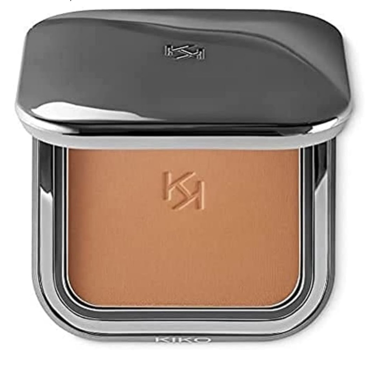 La poudre bronzante se présente dans un écrin élégant gris acier, portant le logo KK gravé sur le couvercle. Le boîtier à fermeture magnétique est équipé d’un miroir intérieur.