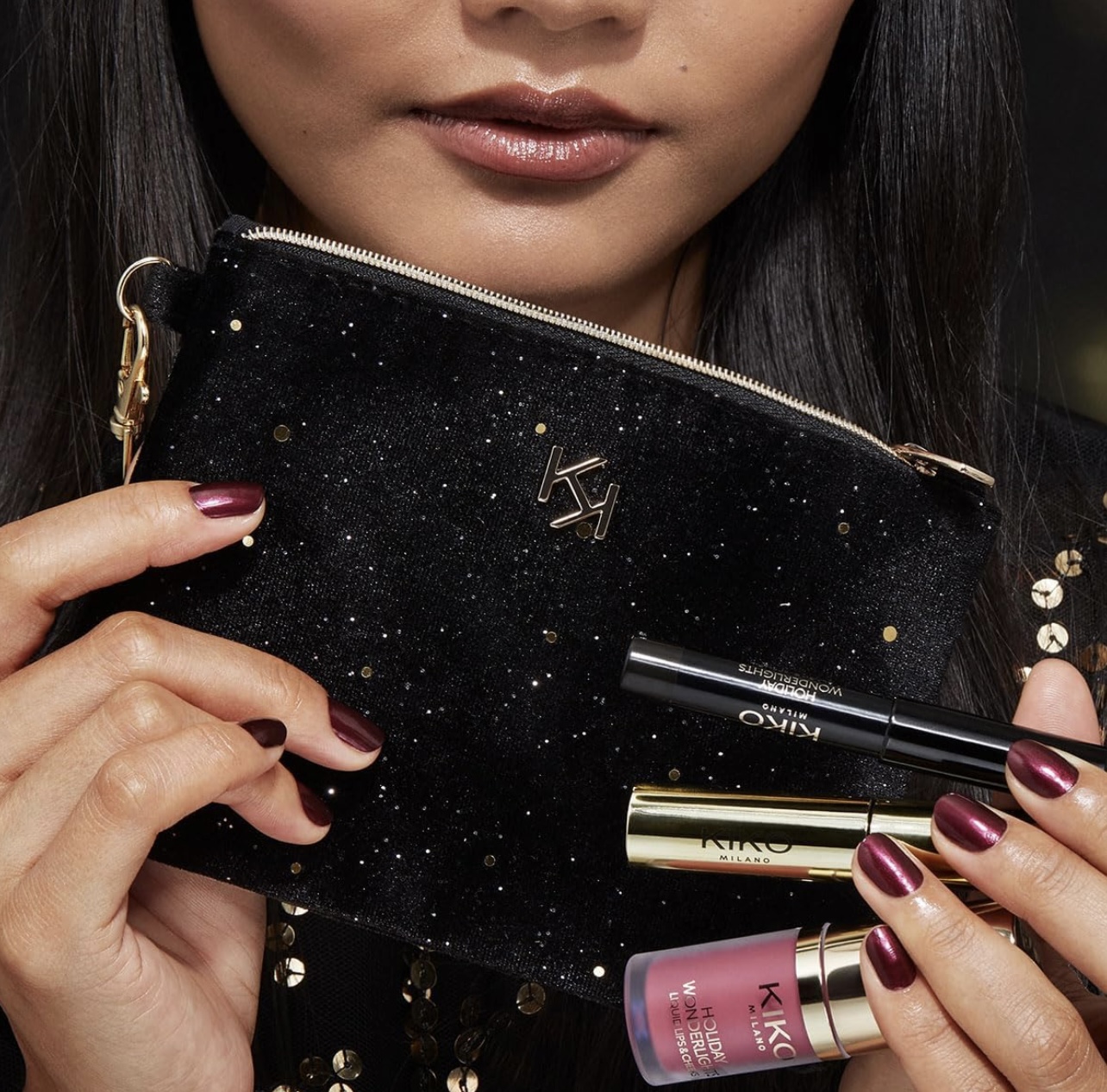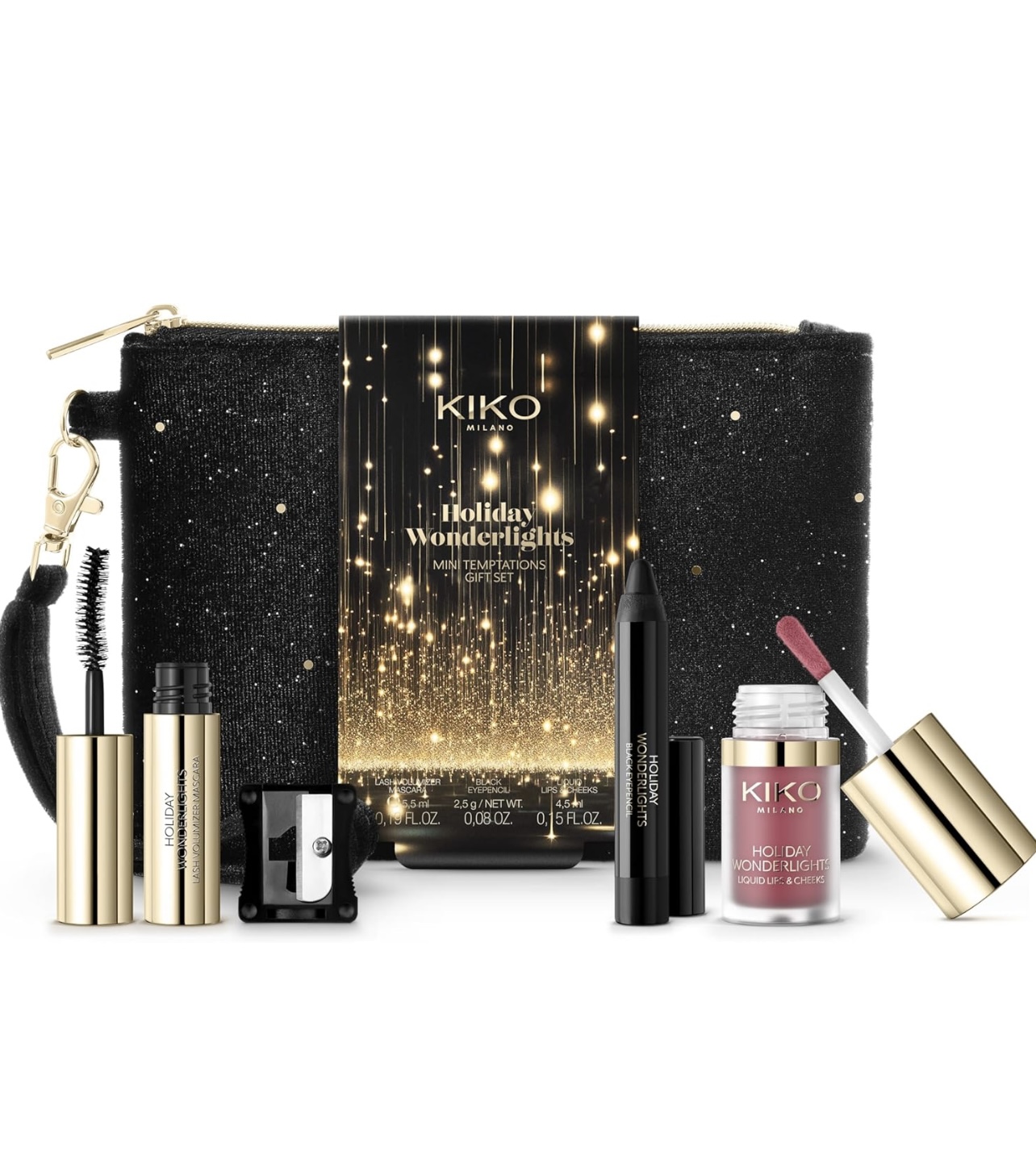 Coffret maquillage composé d’un mascara à effet volumateur, d’un crayon noir pour les yeux, d’un rouge à lèvres et d’un blush liquide en format mini dans une pochette raffinée.