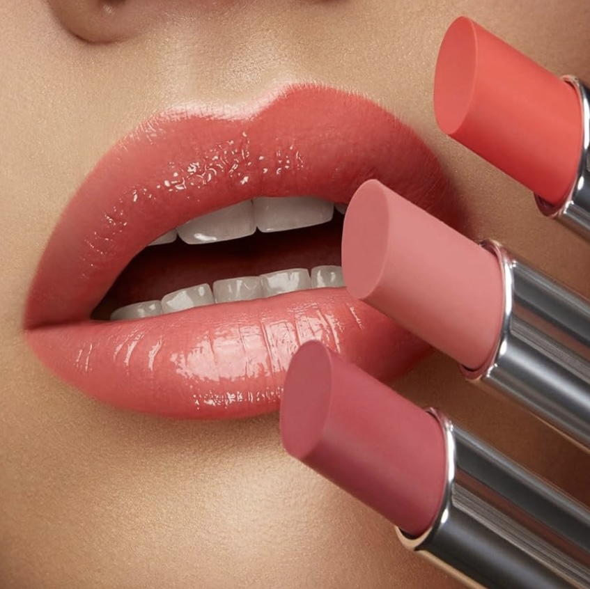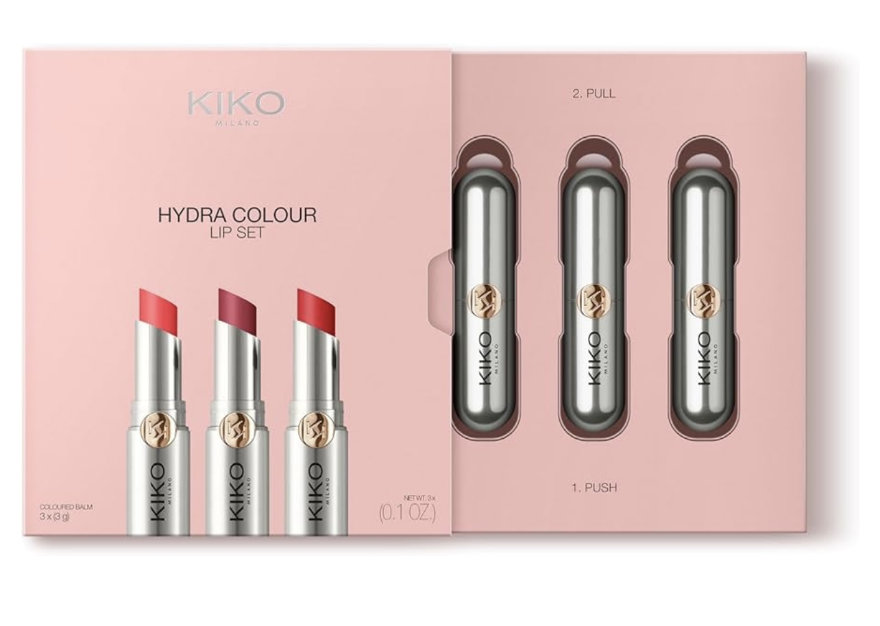 Kit de maquillage pour les lèvres composé de 3 baumes à lèvres colorés hydratants, dans une élégante boîte en papier.