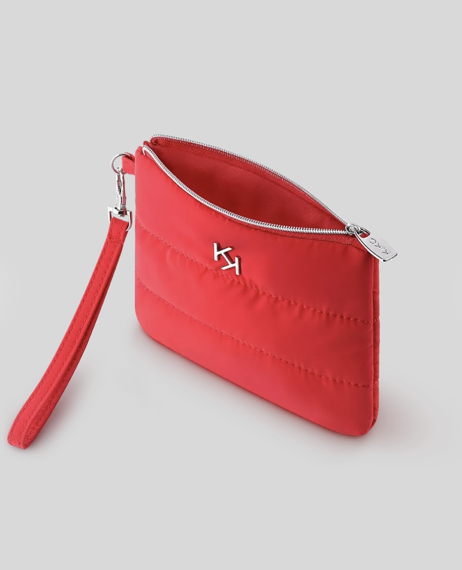 Inspirée par le design iconique des doudounes de montagne, cette trousse à l’allure d’après-ski transforme votre rituel en un moment de pur style. Le tissu rouge aux coutures ton sur ton crée un effet 3D irrésistible, tandis que la fermeture zippée argentée, la dragonne et le logo KK en relief signent l’authenticité de cet accessoire indispensable.