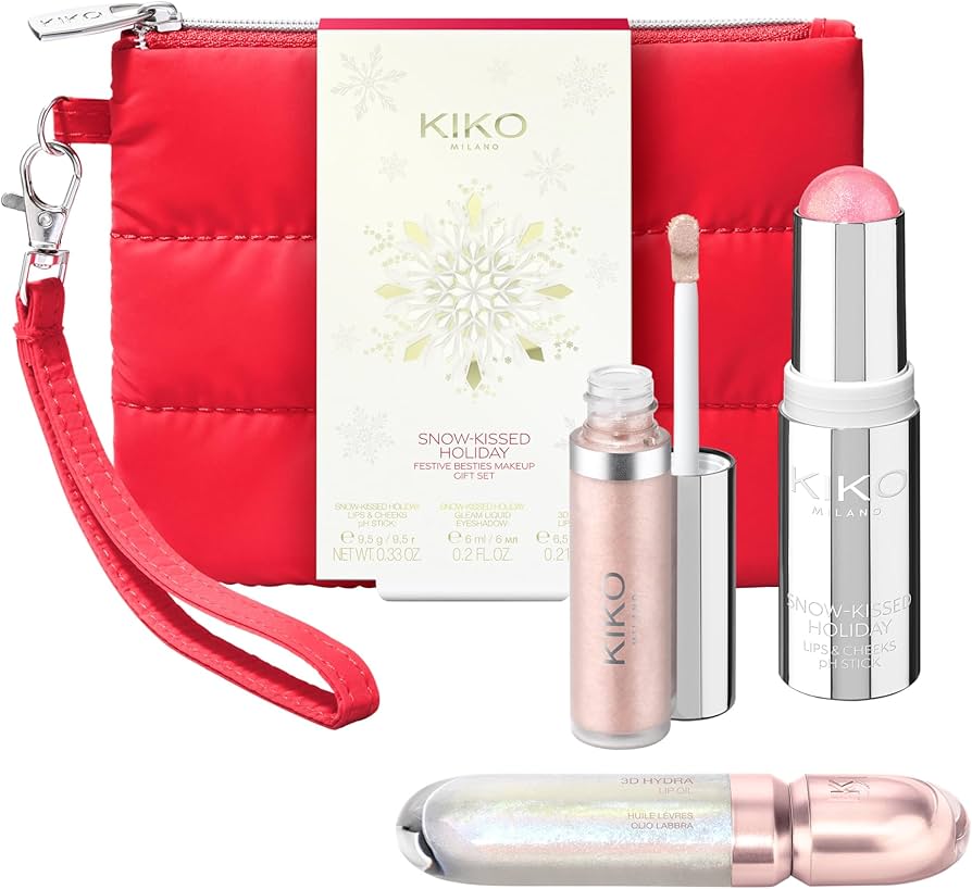 Un coffret cadeau maquillage complet pour les yeux, le visage et les lèvres comprenant : un stick pour les joues et les lèvres réactif au pH, une ombre à paupières liquide holographique et une huile pour les lèvres, le tout dans une trousse en tissu ultra-tendance.